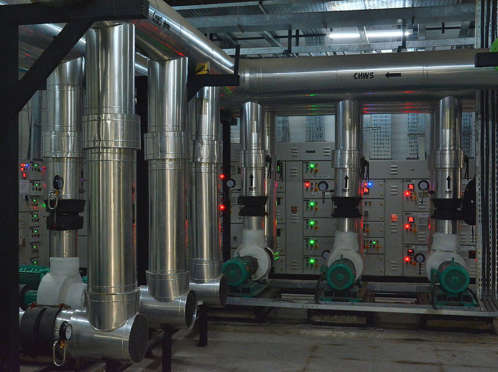 SITC of chilled water low-side works including primary/secondary pumps, cooling towers, AHUs, TFAs, HRWs, and electrical panels